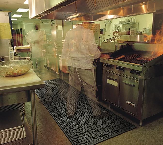 Comfort Flow is a flow-through mat that provides strong anti-fatigue support and is intended for wet environments where grease, oil, or chemicals may be present.